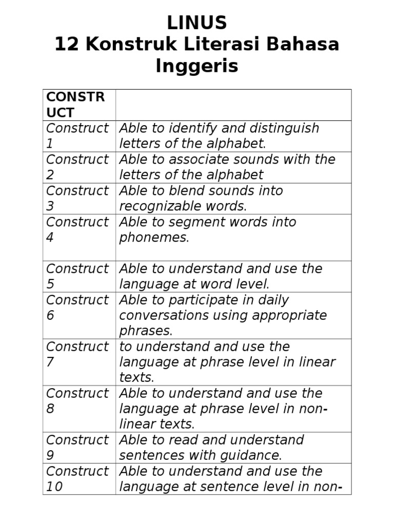 Linus Ppd Kuala Kangsar Konstruk 1 Hingga 12 Literasi Bahasa Melayu Literasi Bahasa Inggeris Numerasi