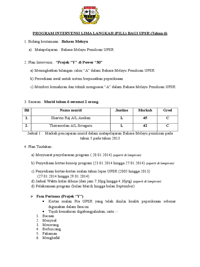 Pelan intervensi bm 1. Muhammad al hafiz bin mohd safingi. Program intervensi lima langkah pill bagi upsr tahun 6 sk.