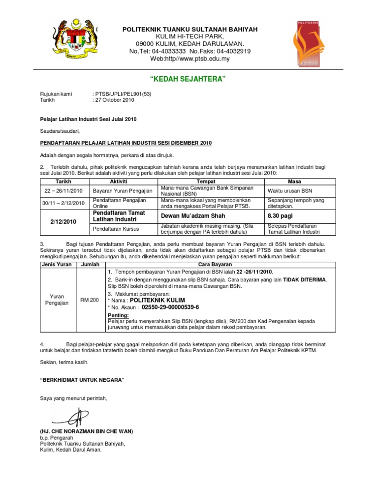 Surat Jawapan Permohonan Tempat Latihan Jawapan Permohonan Tempat Latihan Industri Untuk Dikembalikan Ke Politeknik Tuanku Sultanah Bahiyah No Fax