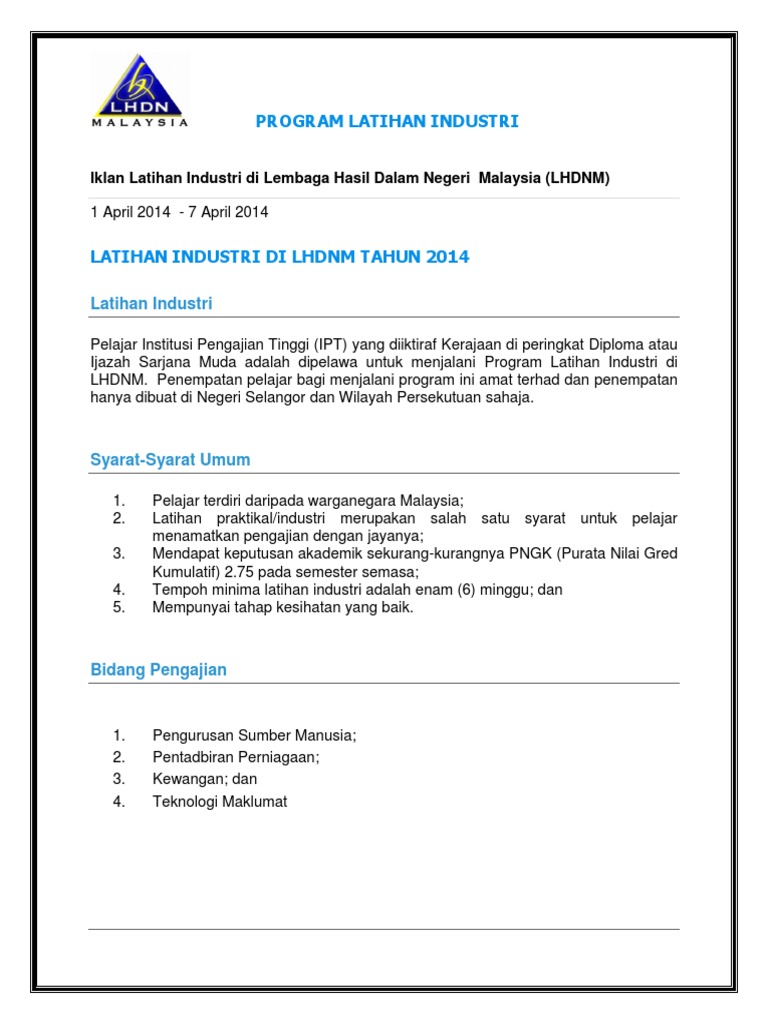 Program Latihan Industri Iklan Latihan Industri Di Lembaga Hasil Dalam Negeri Malaysia Lhdnm