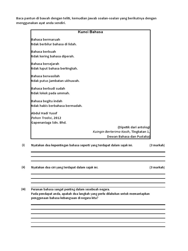 Soalan Sajak Kunci Bahasa Tingkatan 1