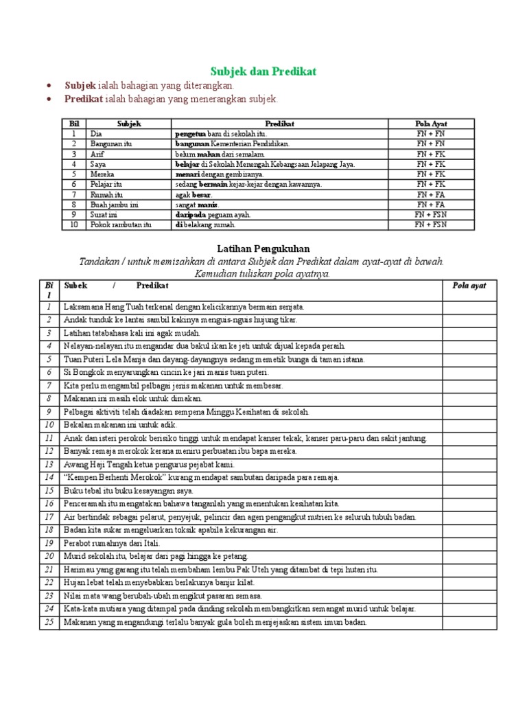 Latihan Subjek Dan Predikat Pt3 Jawapan Bahasa Melayu