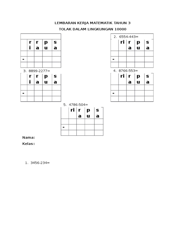 Sudut Matematik Lembaran Kerja 4 Operasi Tolak Cute766