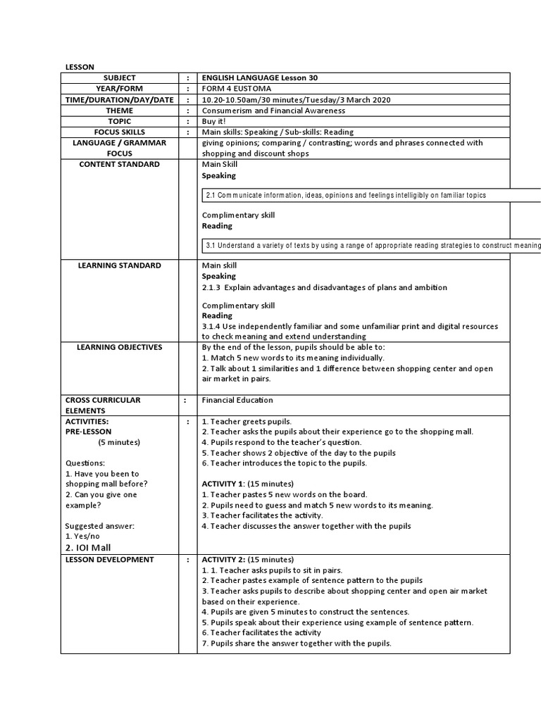 Form 4 Cefr Sample Lesson Plan Template Docx Question Lesson Plan