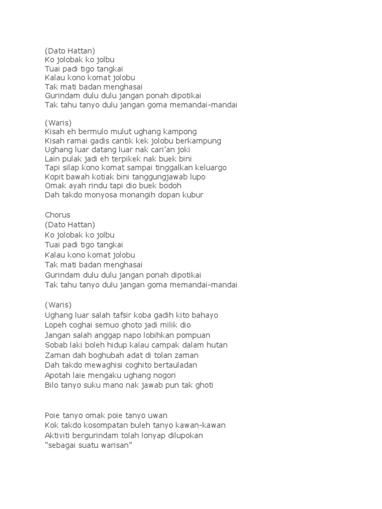 Ko jolobak ko jolobu tuai padi tigo tangkai kalau kono komat jolobu tak mati badan menghasai gurindam dulu dulu jangan ponah dipotikai tak tahu tanyo dulu jangan goma memandai mandai waris coghito eh bermulo mulut ughang kampong kisah ramai gadis cantik kek jolobu berkampung ughang luar datang nak cari an joki. Lirik lagu gadis jolobu w a r i s hattan dato hattan ko jolobak ko jolbu tuai padi tigo tangkai kalau kono komat jolobu tak mati badan menghasai guri sorry you have javascript disabled. Lirik lagu kesihatan wanita.