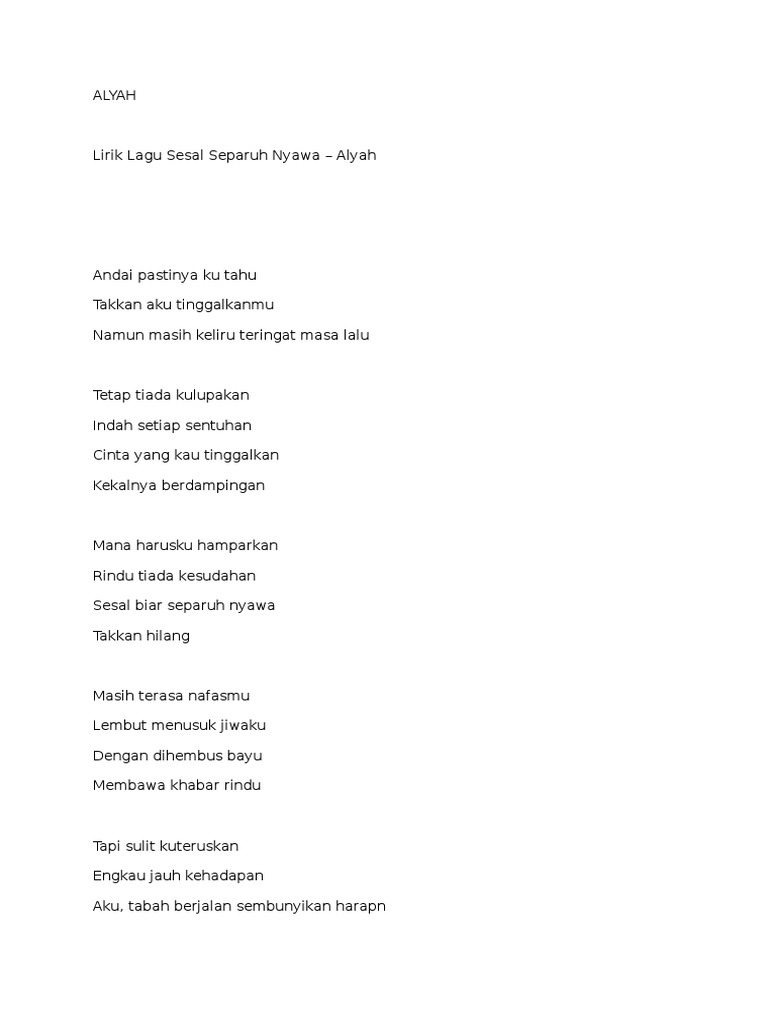 Lirik Lagu Sesal Separuh Nyawa Alyah Lirik Lagu Pdf Document