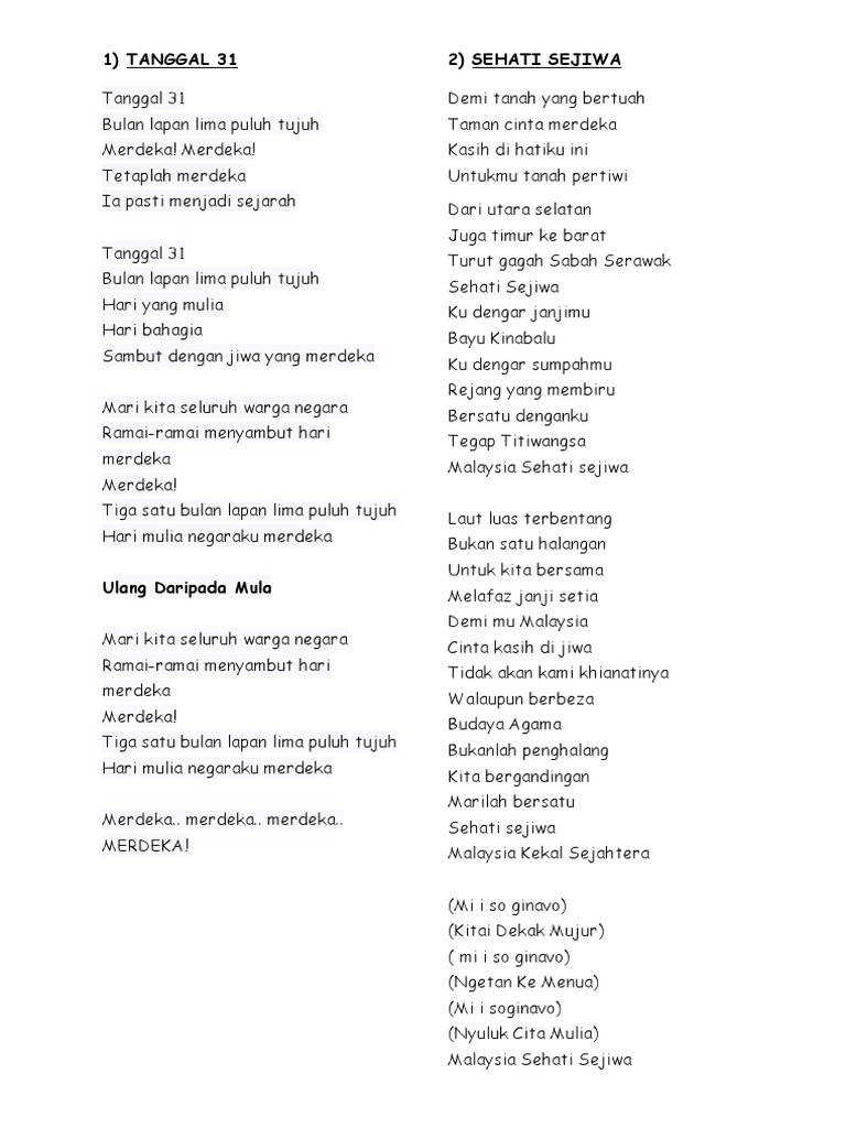 Lirik Lagu Tanggal 31 Docx Lirik Lagu Tanggal 31 Tanggal 31 Bulan Lapan Lima Puluh Tujuh Merdeka Merdeka Tetaplah Merdeka Ia Pasti Menjadi Sejarah Course Hero